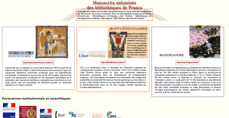 Ces trois bases de données, désignées sous les noms fleuries d’Enluminures, Liber Floridus et Mandragore, réunies sous l’égide d’un site unique, permettent chacune et respectivement un accès aux manuscrits enluminés des Bibliothèques municipales, des Bibliothèques de l’enseignement supérieur et de la BNF.