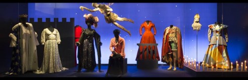 Jeu d’équilibre entre des textes dépourvus de didascalies mais chargés de références souvent difficilement traduisibles et diversement interprétables, et la lecture à facettes de metteurs en scène très inspirés par ces mystères : pour célébrer les 450 ans du grand Will, le Centre National du Costume de Scène cis à Moulins a voulu revenir sur cette genèse particulière en proposant une exposition en trois temps. Plongée dans le cercle et les arcanes d’un théâtre élisabéthain, évocation des différentes typologies de vêtures du répertoire, depuis le puissant jusqu’au paysan, regard sur les interactions entre grands metteurs en scène, grands acteurs et grands stylistes.