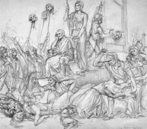 Rousseau et la Terreur (Institut et Musée Voltaire, Genève). Peu d’écrivains auront autant inspiré les caricaturistes que Rousseau. Parodiant la statue de James Pradier, érigée à Genève en 1828 pour le cinquantenaire de la mort de Rousseau, ce dessin anonyme du début du XXe siècle, montre le penseur assistant, effaré, au sinistre aboutissement de ses idées généreuses. Pour Robespierre, Jean-Jacques est le « précepteur du genre humain » et les Révolutionnaires feront transférer ses cendres au Panthéon. À l’inverse, les réactionnaires le tiendront pour grand responsable de tous les maux. Visitant la chambre de Rousseau à Ermenonville, Bonaparte aurait dit: « Votre Rousseau était un fou, c’est lui qui nous a menés où nous en sommes ». Ni les uns, ni les autres ne l’avaient vraiment compris!