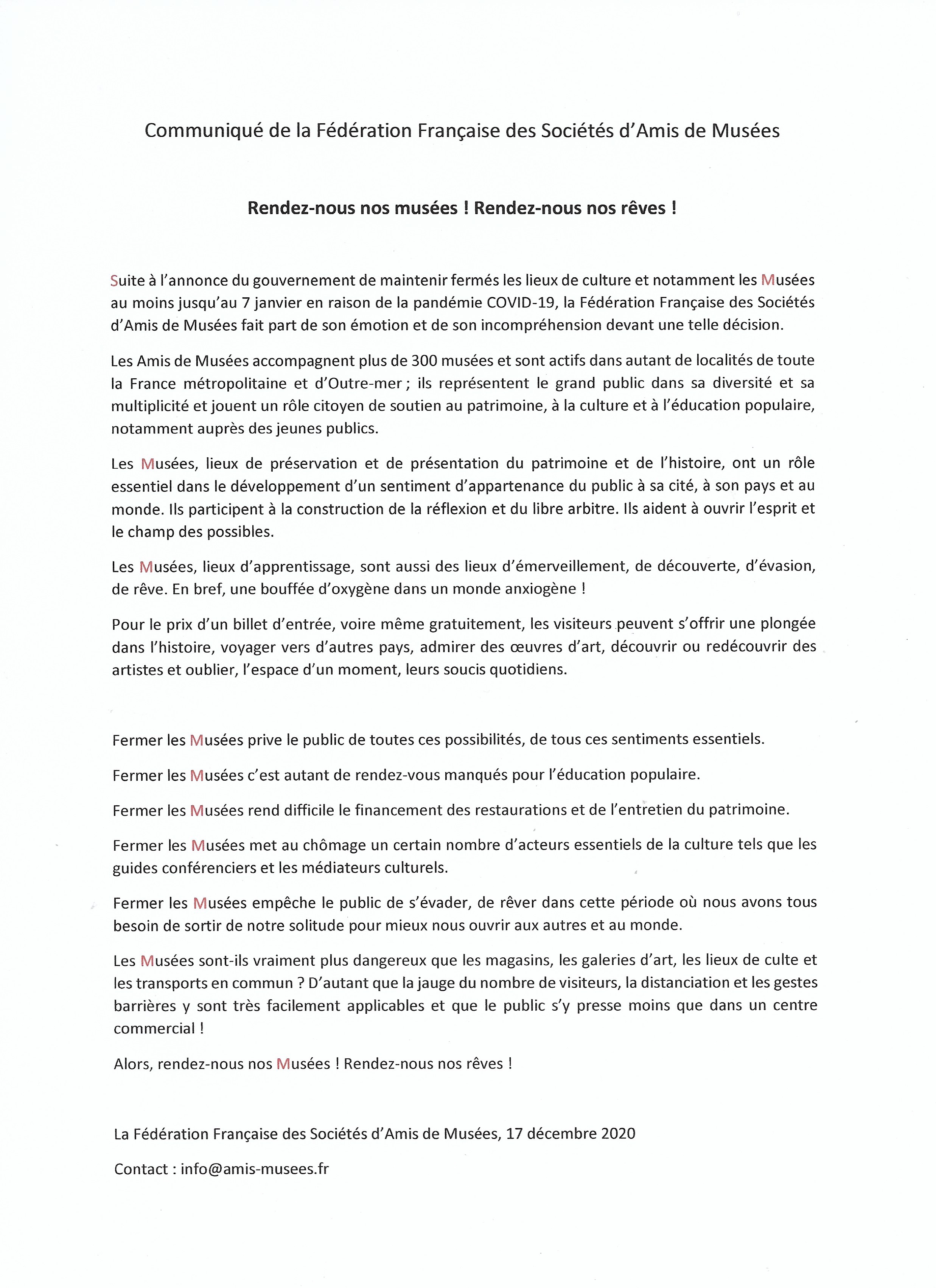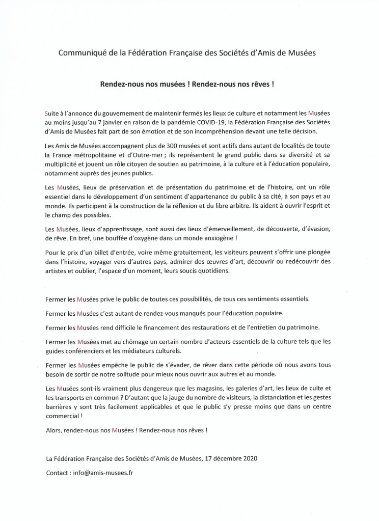 Merci de ce soutien. Les associations, Sociétés amis de Musée traversent avec leur patrimoine cutlurel un LONG sentiment de solitude et d’être ignorées. Il est d’autres groupements religieux qui ont ainsi sacrifié « la culture » .