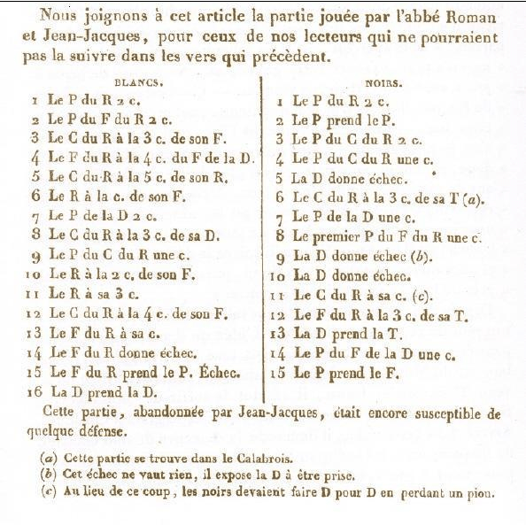 Il évoque aussi la partie contre Conti et cite la source : « Ce document a été reproduit par la revue Le Palamède , année 1843, p. 41-42, au milieu d’une fantaisie de Marie Aycard, dit «Jean-Jacques et le prince de Conti». L’original avait été communiqué à la revue par ses abonnés, M. Doazan, «possesseur de fort curieux manuscrits sur les échecs au siècle dernier». «