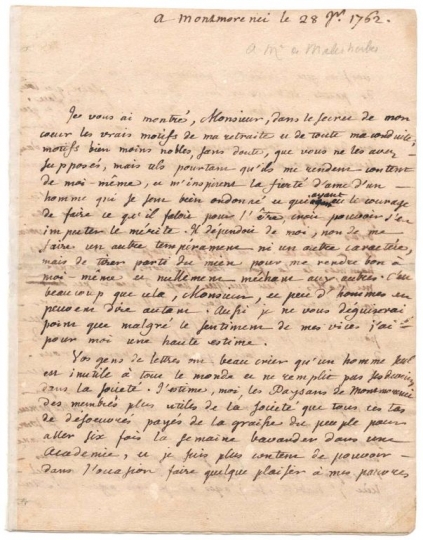 Enfin lassé d’ une vapeur enivrante qui enfle sans rassasier, excédé du tracas des oisifs surchargés de leur temps et prodigues du mien, soupirant après un repos si cher à mon coeur et si nécessaire à mes maux, j’ avois posé la plume avec joye. Content de ne l’ avoir prise que pour le bien de mes semblables, je ne leur demandois pour prix de mon zèle que de me laisser mourir en paix dans ma retraite, et de ne m’ y point faire de mal.