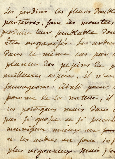 Il y a pourtant ici, continuai-je, une chose que je ne puis comprendre; c’est qu’un lieu si différent de ce qu’il était ne peut être devenu ce qu’il est qu’avec de tout est verdoyant, frais, vigoureux, et la main du jardinier ne se montre point ; rien ne dément l’idée d’une île déserte qui m’est venue en entrant, et je n’aperçois aucun pas d’hommes.